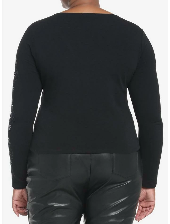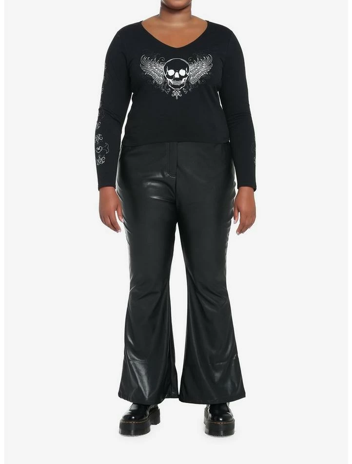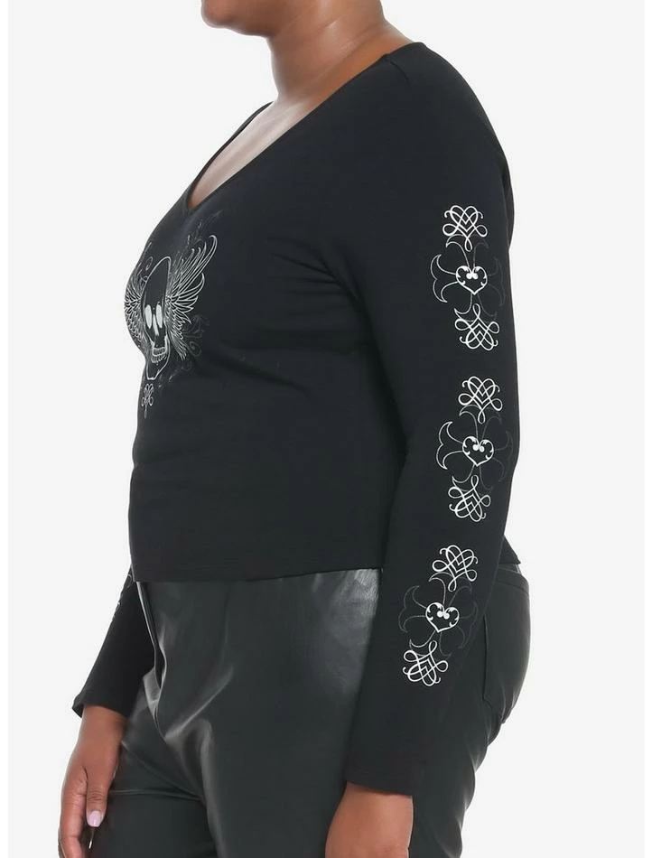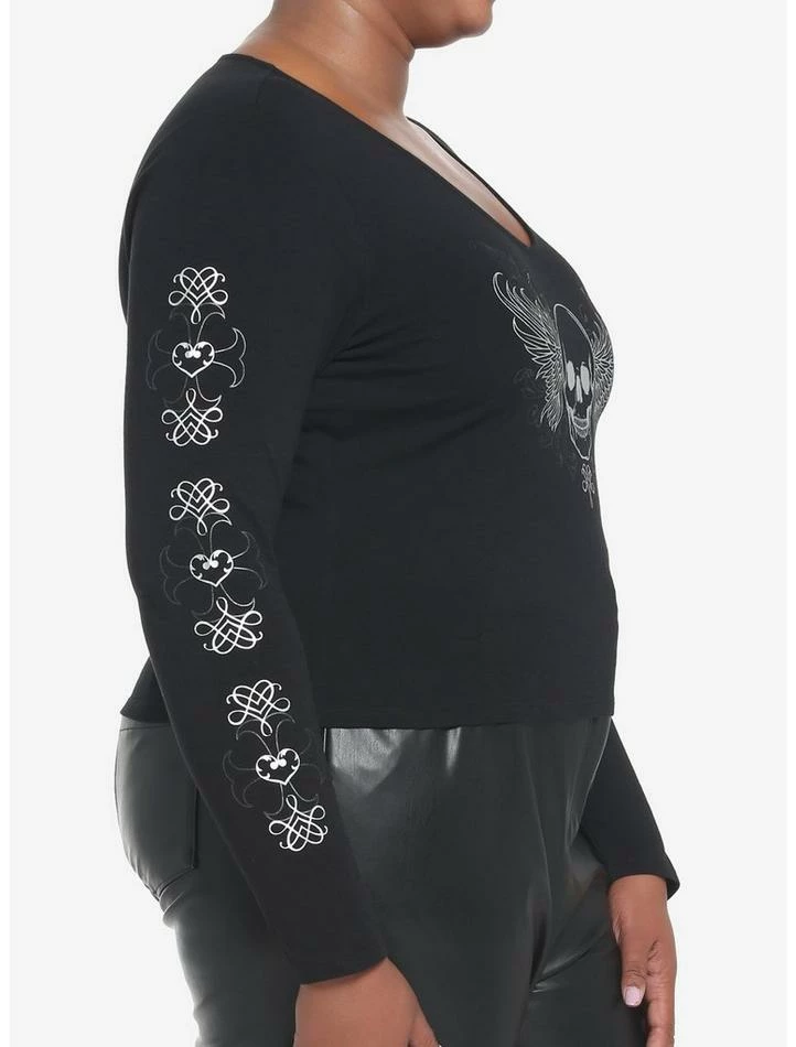 Channel biker gang vibes in this long-sleeve top. The front features a winged skull and the sleeves have hearts and crosses. Cropped fit and V-neckline.