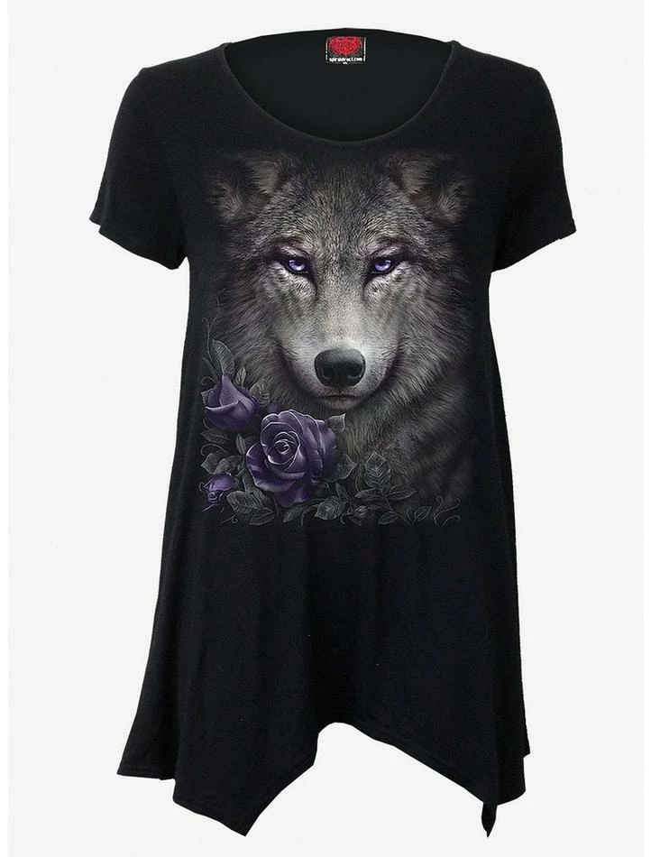 Fixed by a cold lupine stare, you stop dead in your tracks. The forest closes in around you until there is only you and the wolf. She readies herself to attack and the petals fall as her teeth sink in. This handkerchief tunic top is made of jersey using skin friendly, Azo-free, reactive dyes.