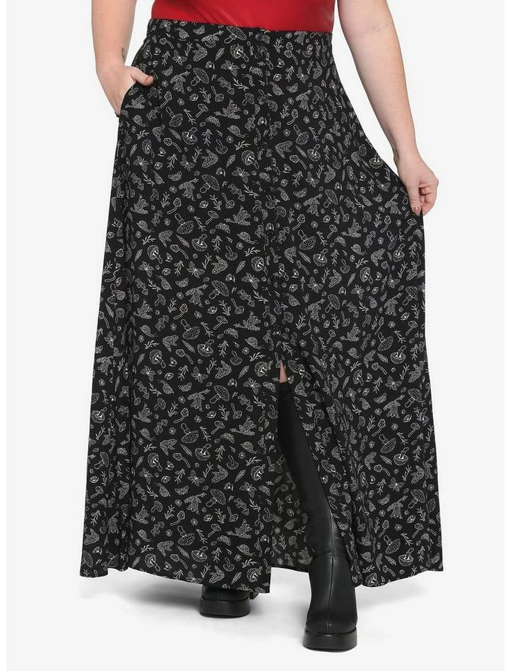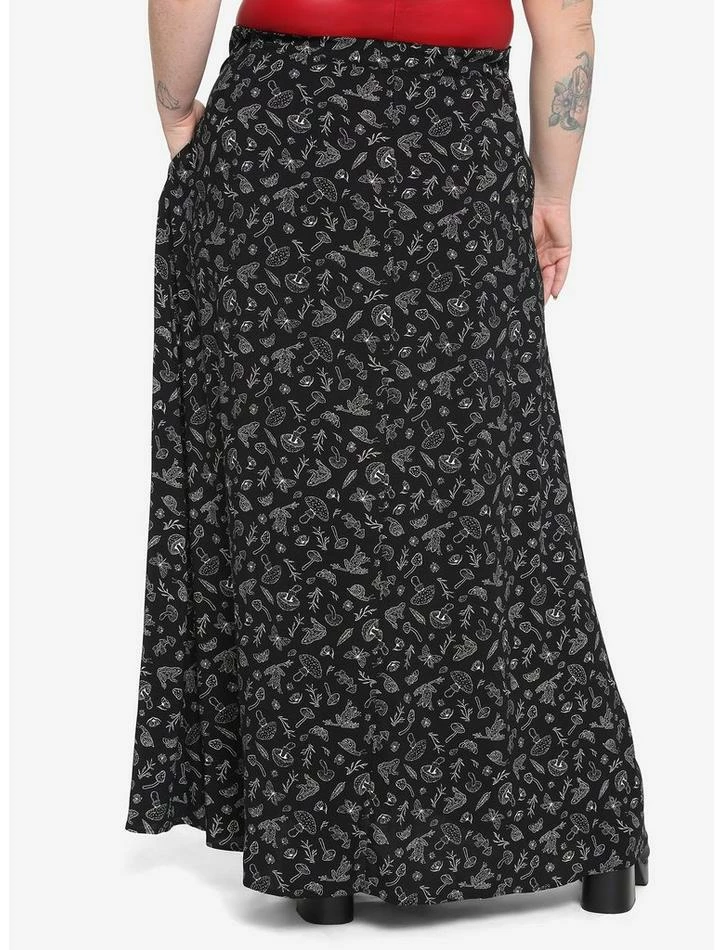 Look like a woodland goddess in this black and white maxi skirt, featuring an allover print of mushrooms, frogs and leaves. There are functional buttons down the front, along with a front slit and pockets to hold your foraging treasures!