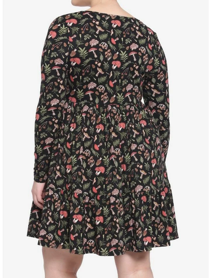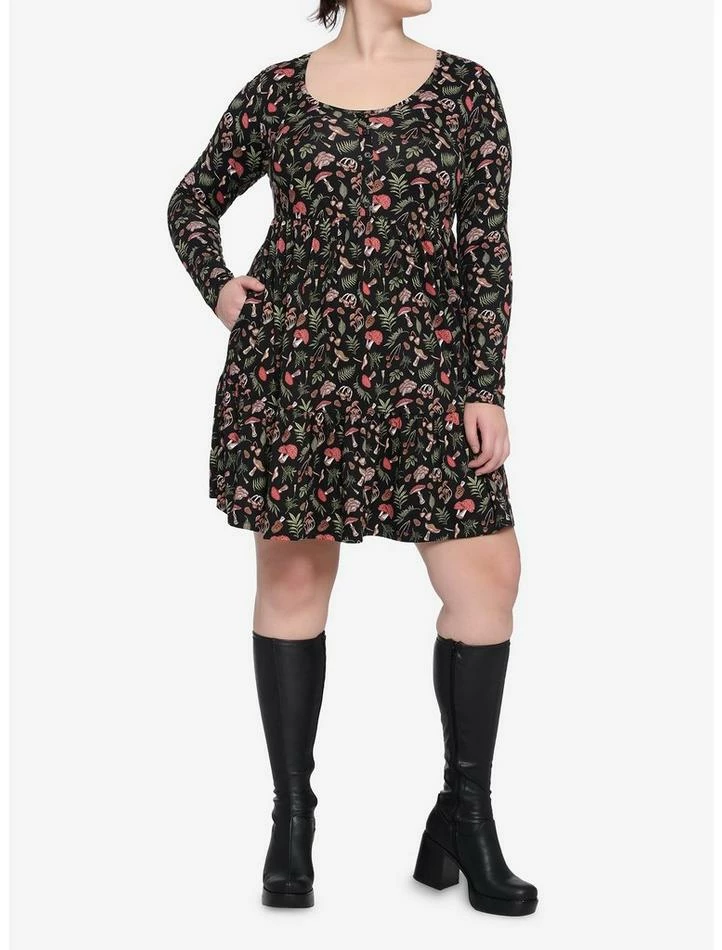 Wear your love for mushrooms as you take a stroll through the woodland forest in this soft and stretchy dress! Featuring an allover print of mushrooms and leaves, faux button up detailing, tiered skirt and pockets!