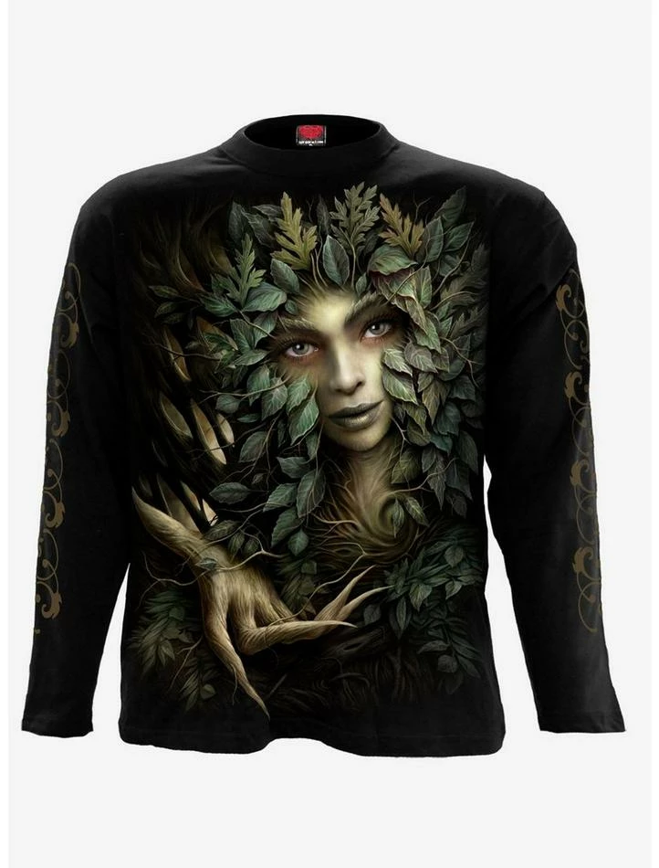 From seed to sapling and into powerful maturity, she is the ruler of all that grows from beneath the precious soil, stretching up towards the heavens. Graceful and Majestic, the sworn protector of the forest reaches out a welcoming hand, an invitation, if you wish to accept it, to nurture the beauty that she will be overseeing until the earth gasps its final breath. This Long-Sleeve T-Shirt is made of top quality cotton jersey using skin friendly, Azo-free, reactive dyes.