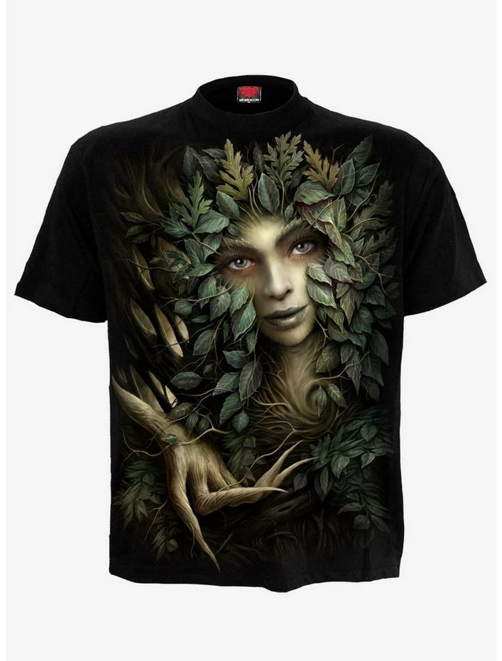 From seed to sapling and into powerful maturity, she is the ruler of all that grows from beneath the precious soil, stretching up towards the heavens. Graceful and Majestic, the sworn protector of the forest reaches out a welcoming hand, an invitation, if you wish to accept it, to nurture the beauty that she will be overseeing until the earth gasps its final breath. This T-Shirt is made of top quality cotton jersey using skin friendly, Azo-free, reactive dyes.