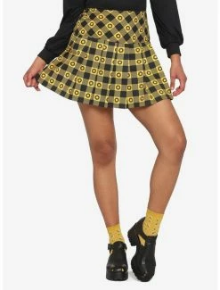 Let your look bloom in this skirt featuring a yellow and black plaid pattern with flower detailing, pleats and back zipper closure.