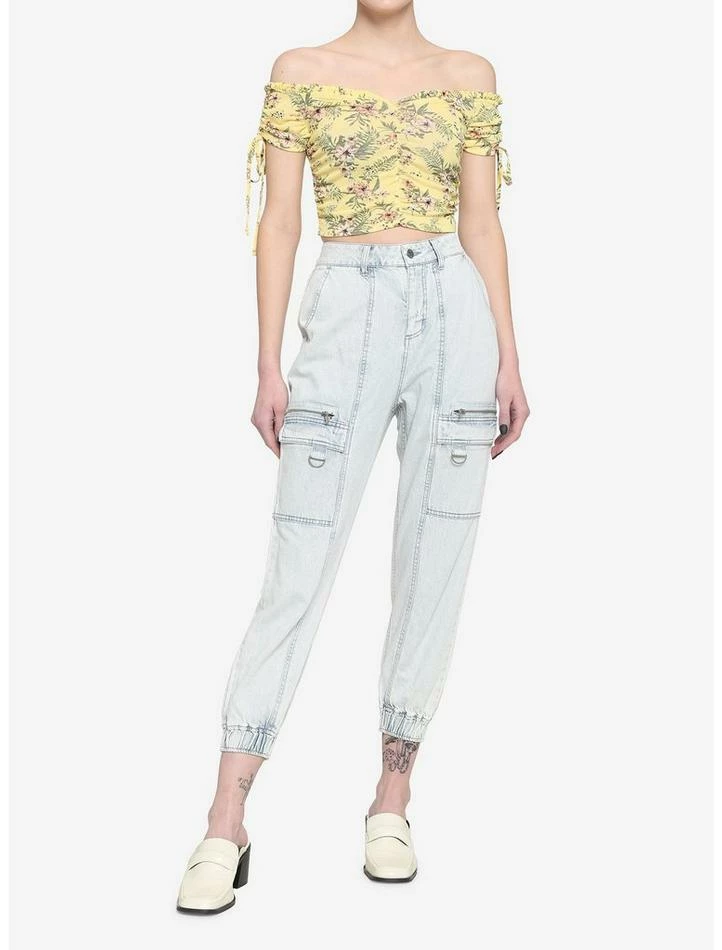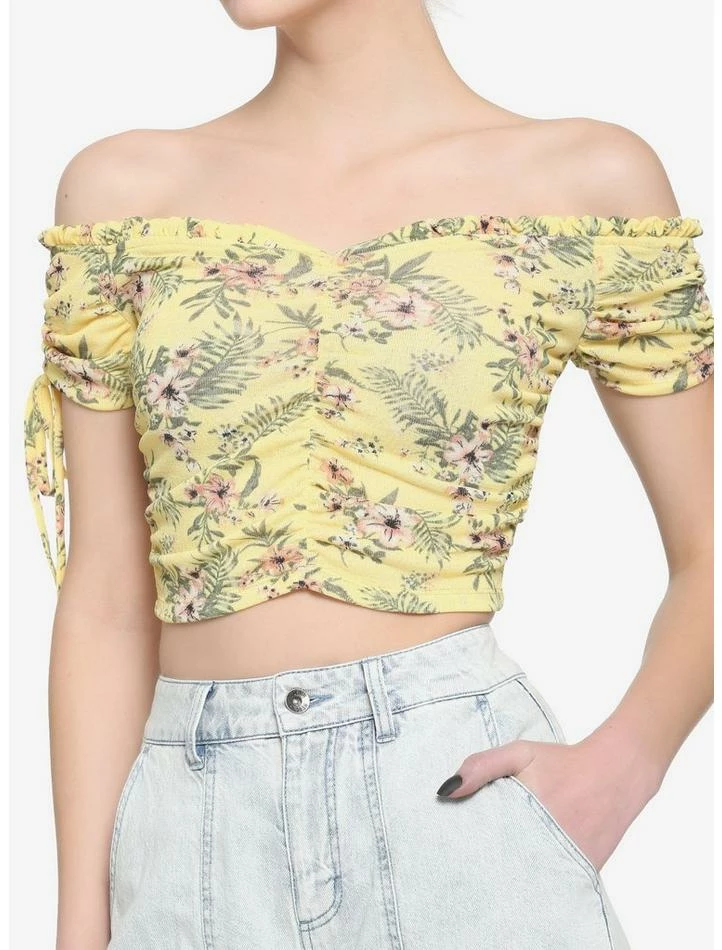Let your look bloom in this yellow off-the-shoulder top featuring a floral print, cinched sleeve detail, ruching down the center and cropped length.