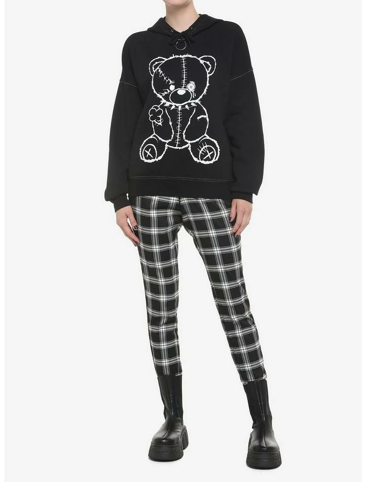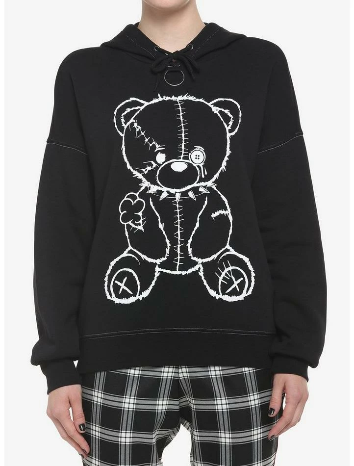 ย If the idea of a zombie teddy bear fits your vibe, this is the hoodie for you. It has white contrast stitch, an O-ring detail at the neck and a large graphic of a cute-but-dead teddy bear. Drawstring hood.